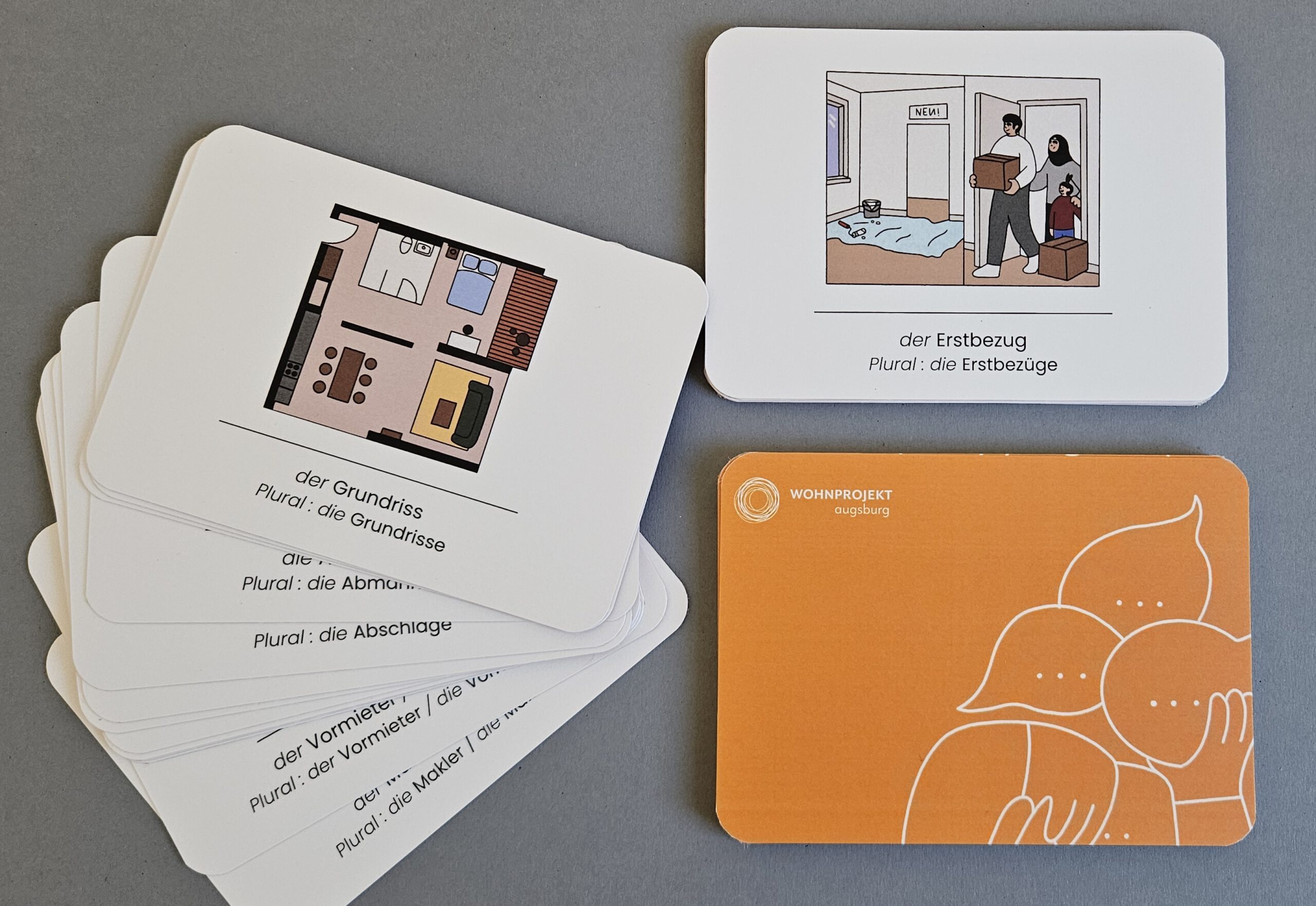 Gemeinsam mit Haupt- und Ehrenamtlichen aus dem Deutsch-Café und Wohnprojekt Augsburg wurden dafür relevante Begriffe und Themen identifiziert und von der Augsburger Illustratorin Lisa Klimesch illustriert. Entstanden sind so u.a. 51 Bild-Vokabelkarten, die letzte Woche zusammen mit einer bunten Materialsammlung an unterschiedlichen Textbeispielen, Infoblättern und Übungsmaterialien im Deutsch-Café von Tür an Tür vorgestellt wurden.